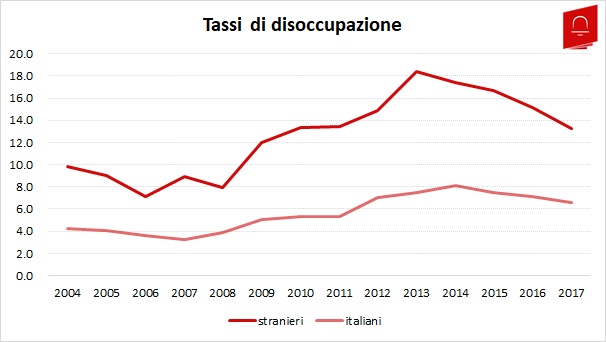 Dal 2004 a oggi, il tasso di disoccupazione dei residenti stranieri è rimasto ampiamente al di sopra di quello dei cittadini italiani, come mostra il grafico sottostante. Per quanto riguarda il livello di occupazione, anche se prima del 2008 gli stranieri risultavano più occupati rispetto agli italiani, in seguito alla crisi 2009-2011 il tasso di occupazione dei residenti stranieri è calato marcatamente scendendo al di sotto di quello degli italiani, che è rimasto piuttosto stabile. Attualmente il divario tra livelli occupazionali è ancora ampio (più di 4 punti percentuali).